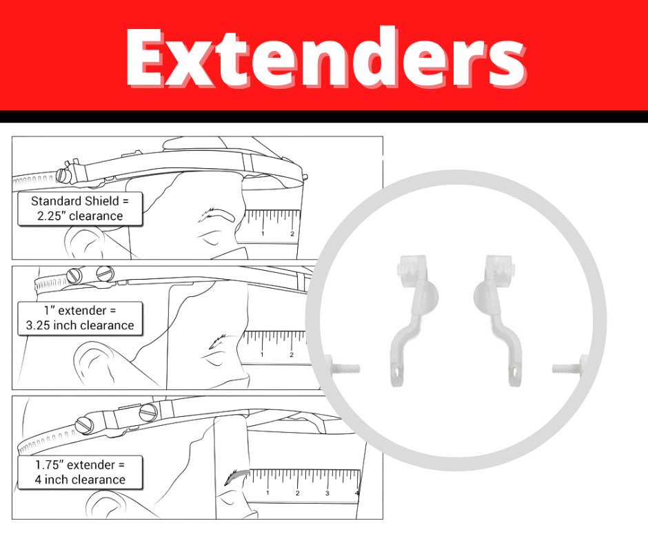 Sometimes one size does not fit all. That’s why we created optional extenders so that you can customize your face shield fit. Our extenders give you up to a 4 inch clearance – accommodating larger loupes and light systems!