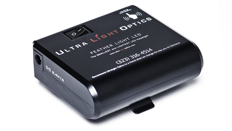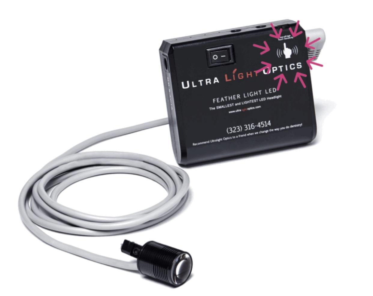 Ultralight Optics headlight are designed by dentists, for dental professionals. The hands-free touch sensor gives you the ability to turn the light on and off by touching the battery pack with the clean side of your wrist or elbow.