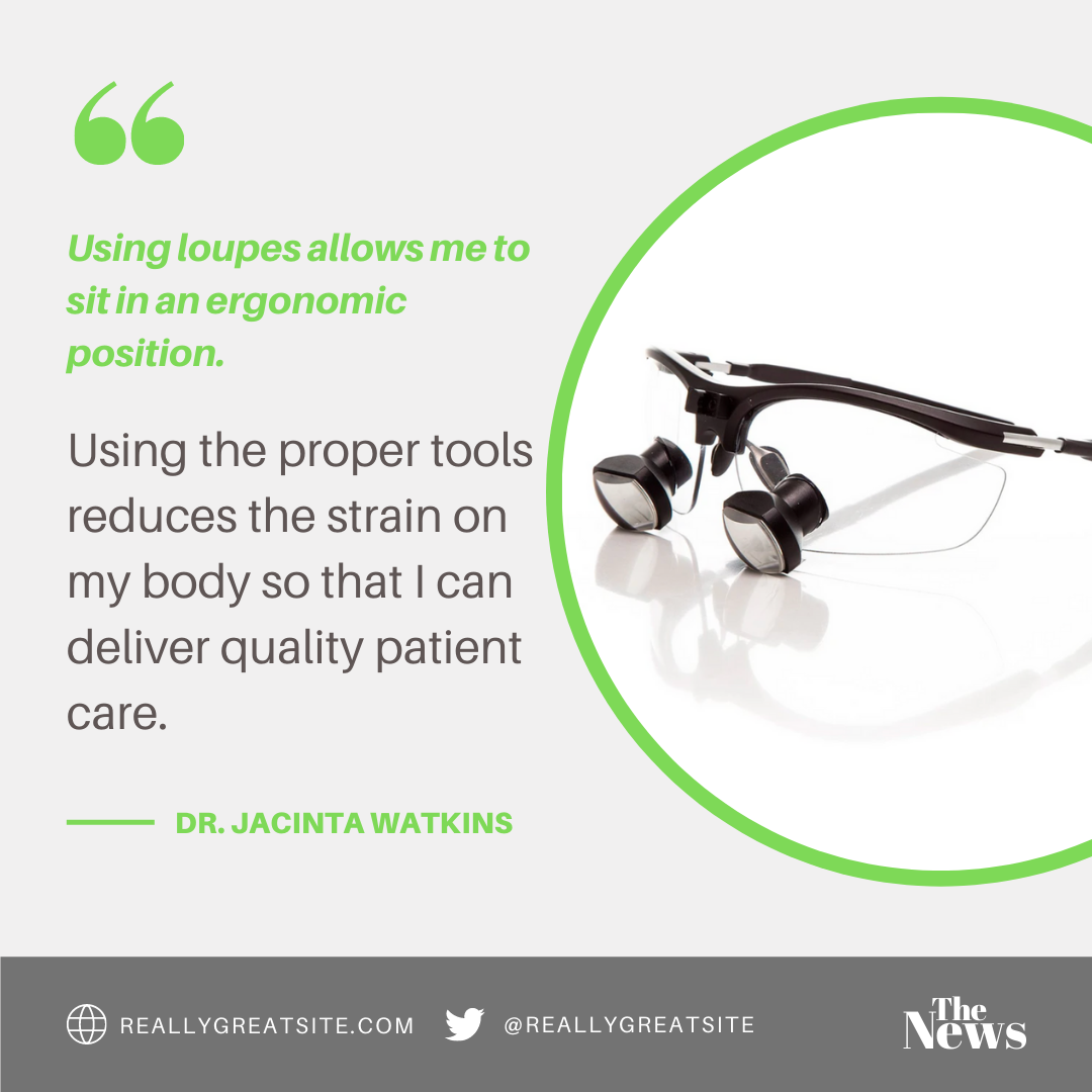Personally, I have found that using loupes allows me to sit in a comfortable ergonomic position. Being equipped with proper tools has helped reduce the strain on my body while giving me the ability to deliver quality patient care.